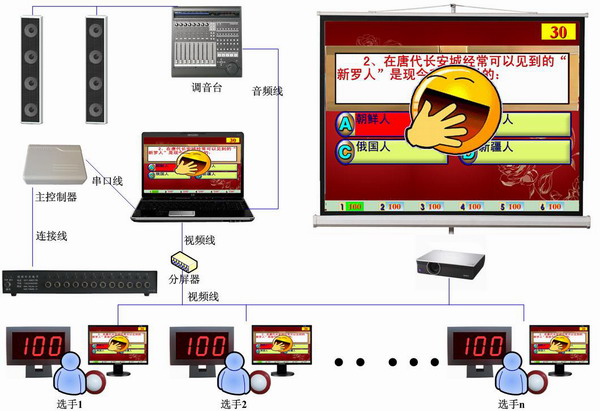 2:电脑及大屏幕同步出题: 题目类型包括问答题,选择题,填空题,图片题,连线题,多媒体题,音频题,视频题,flash题目,联想题,记忆题,猜词题等等方式,在屏幕显示题目时,同时有倒计时显示。 我们出题最大的特点是,题目类型显示自由搭配,可以做到一道选择题,一道问答题,一道连线题等循环,在题库中任意设置每个环节的题目出题顺序,题目类型等。 题目编辑输入可视化设计,即可见即所得的方式,在题目输入时可以设置每道题,题目和答案的字体颜色、大小、字体样式,显示位置等等参数,根据不同的赛事类型显示不同风格的效果。 3:出题方式: (1)随机出题方式:大屏幕题号滚动显示,由选手自行按下抢答器,大屏幕的题号即可停止,这样赛场上的互动性增强,也使现场的娱乐性增加。这是我们国内独有的一种形式。 (2)顺序出题 (3)滚动选题 (4)按题号出题 等等