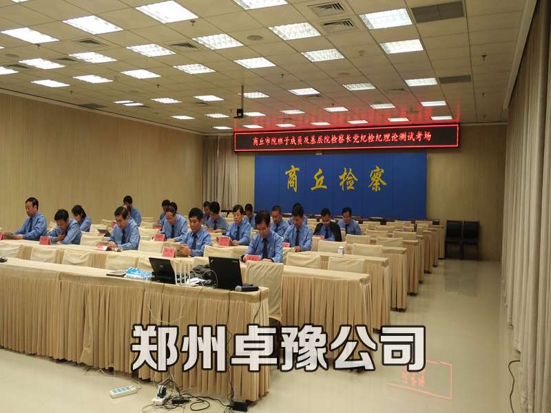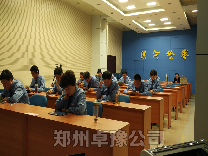 河南省检察院党纪检纪理论考试隆重举行,此次考试在各个地市分为十八个分考场,采用平板电脑在同一局域网内随机分配题目的无线答题形式,考卷提交后立即得出分数,此次考试有郑州卓豫电子科技有限公司全程提供技术支持。