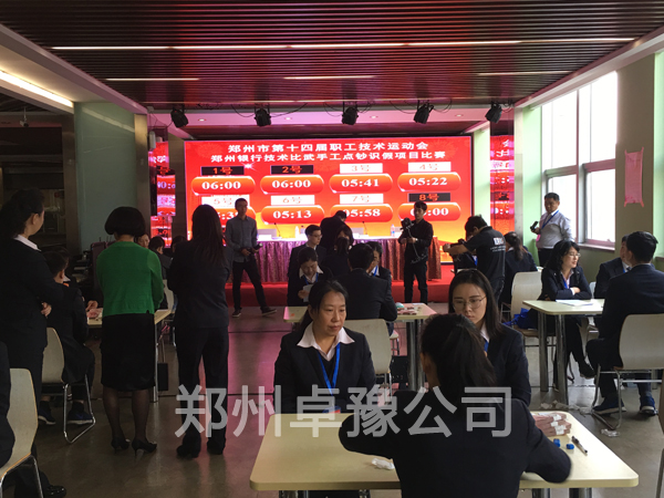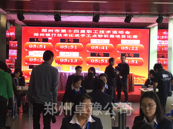 郑州银行技术比武隆重举行,郑州卓豫公司提供点钞多路计时软件设计,硬件设备,和全程技术支持。此次大赛最答特点是多路计时系统,大屏幕8位选手同时开始点钞,计时同时开始,选手点钞结束,按键时间即可停止,大屏幕同步显示,在公开透明的环境下进行比赛。