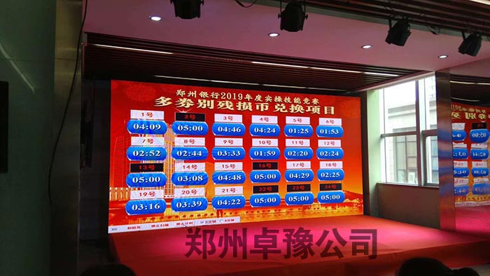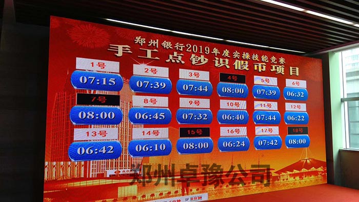 郑州银行2019年实操技能竞赛圆满落下帷幕,我们提供的多路按键计时系统提高了整场活动的效率,21位选手同时开始计时,操作完成按键时间停止。郑州卓豫公司全称提供多路计时器设备及技术服务。多路计时器最大好处在于多个选手可以同时操作,大屏幕同时显示多个选手的计时,选手停止计时按键即可停止,不需要配置多个裁判,节省了人力物力。