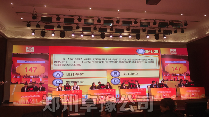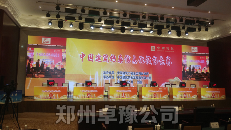 热列祝贺中建七局档案信息化知识竞赛总决赛隆重举行,郑州卓豫公司全称提供抢答器,记分屏,液晶电视,知识竞赛软件出题系统设计制作。此次比赛分为中建风采展示,评委现场打分,知识竞赛等几个环节。